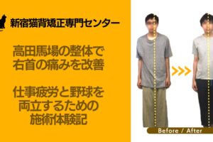 初回施術後、K様は「肩や背中がだいぶ楽になった」と実感されました。猫背の角度が改善され、姿勢が起きている感じが明確に分かったそうです。また、知人からも「背が伸びた?」と驚かれるほどの変化がありました。